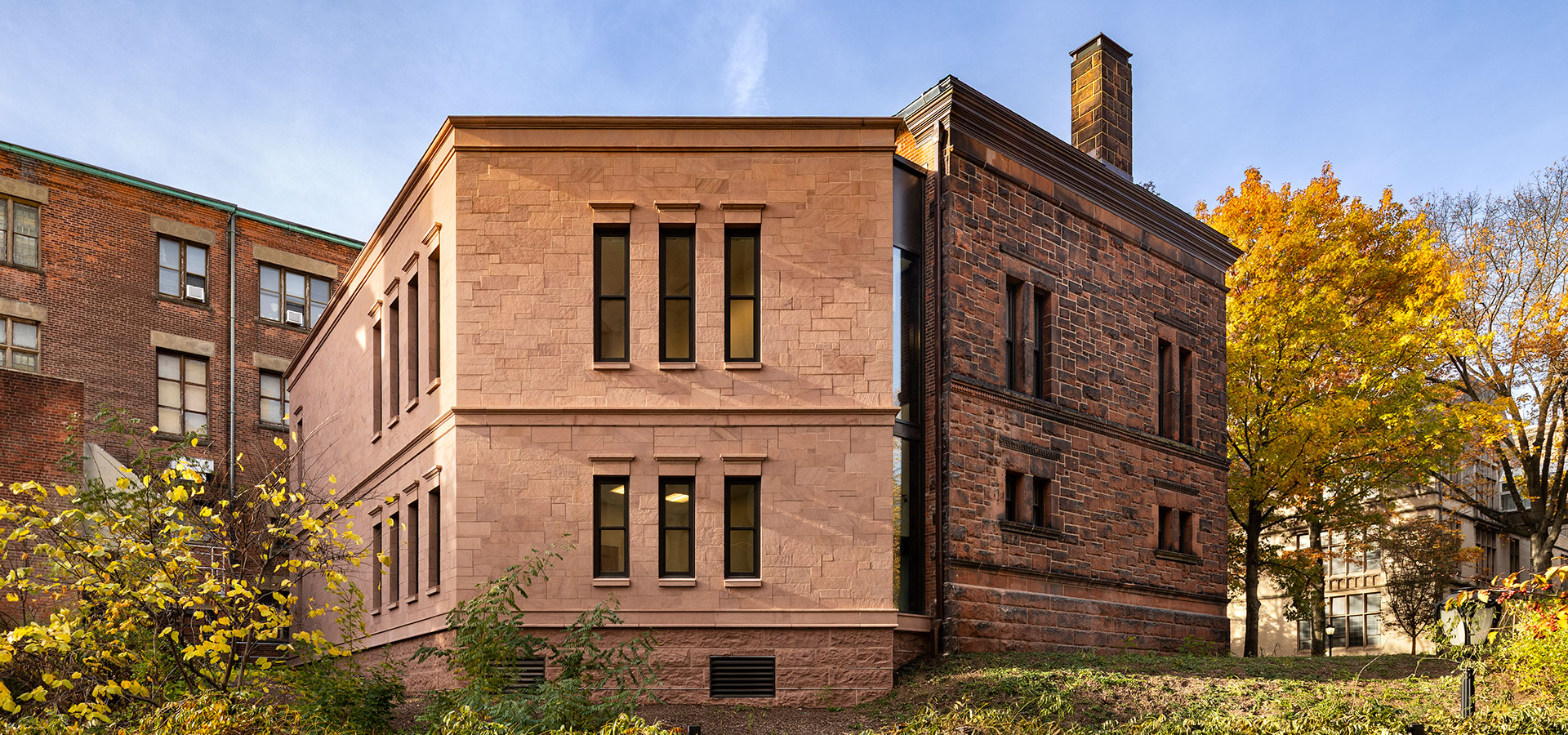The original building was built in 1895 as the fraternity house of Alpha Delta Phi, designed in the Richardsonian Romanesque style by New Haven architect William H. Allen, and remains the main entrance for visitors.